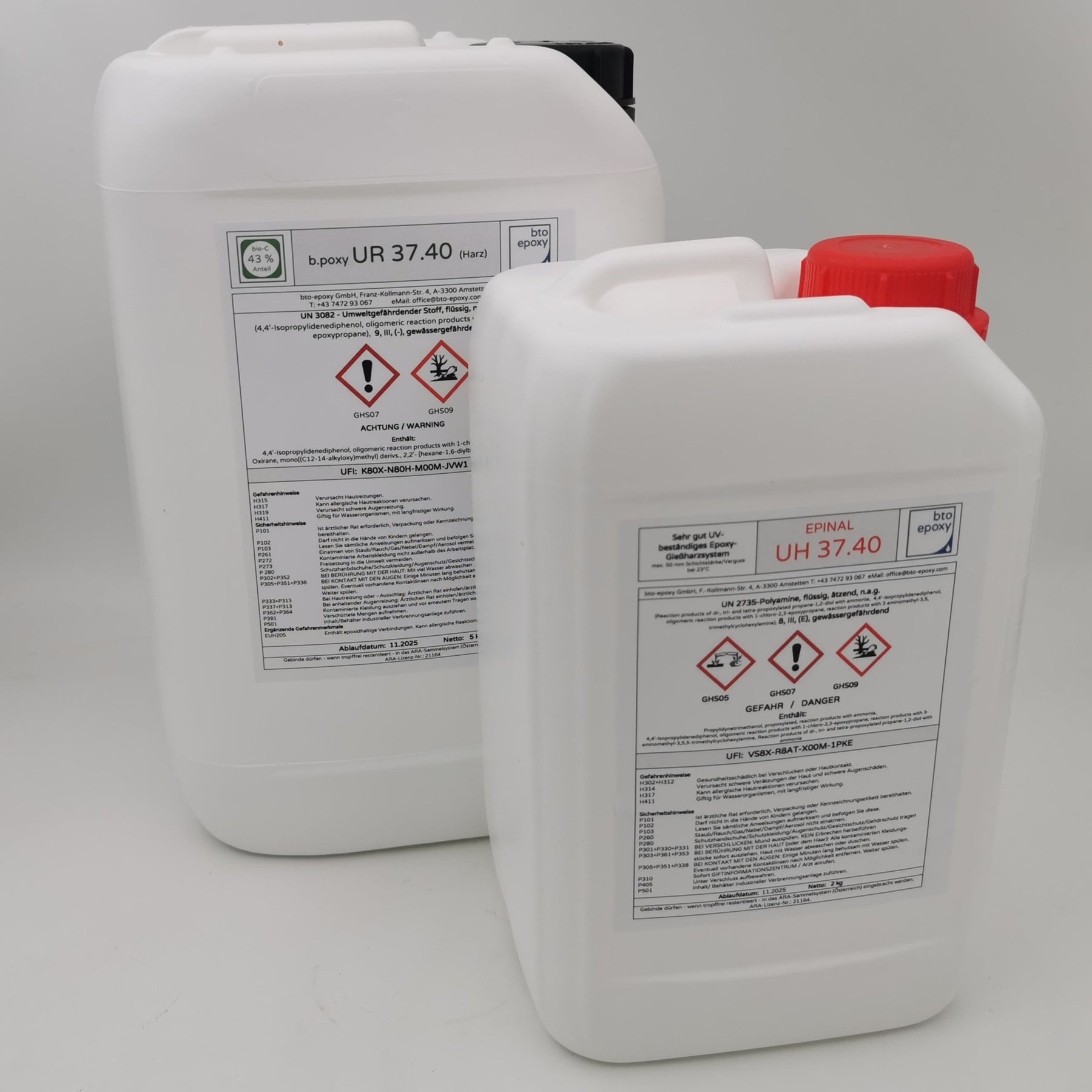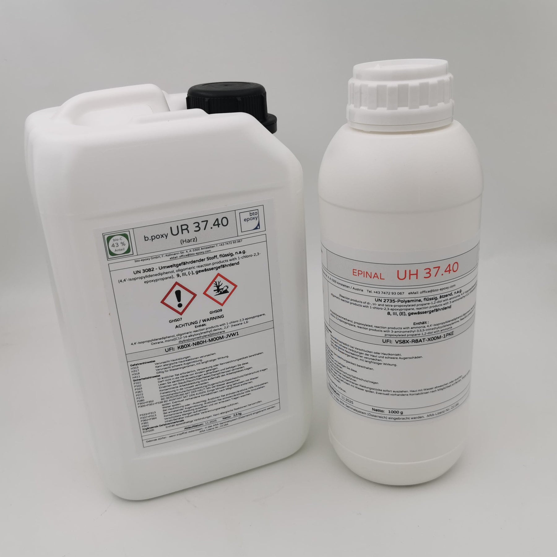 b.poxy UR 37.40 / Epinal UH 37.40 ist ein UV-geschütztes sehr gut lichtbeständiges, transparentes Epoxyharzsystem für viele Gießanwendungen. Durch die reduzierte Reaktionsfreudigkeit des Systems können Schichtstärken bis zu 50 mm in einem Arbeitsgang gegossen werden (Material- & Raumtemperatur max. 23°C). Selbst bei einer Härtungstemperatur von 40°C sind Schichtstärken von 20 mm problemlosherzustellen. Es besitzt ausgezeichnete Haftungseigenschaften auf diversen Geweben, Schaumstoffen, Holz und mineralischen Werkstoffen. Mineralische Füllstoffe sowie auch Leichtfüllstoffe können bei Bedarf problemlos beigemengt werden. Je nach Füllstoffart kann sich dadurch die Topfzeit, Verarbeitungszeit und auch die Härtungszeit verlängern bzw. verkürzen.