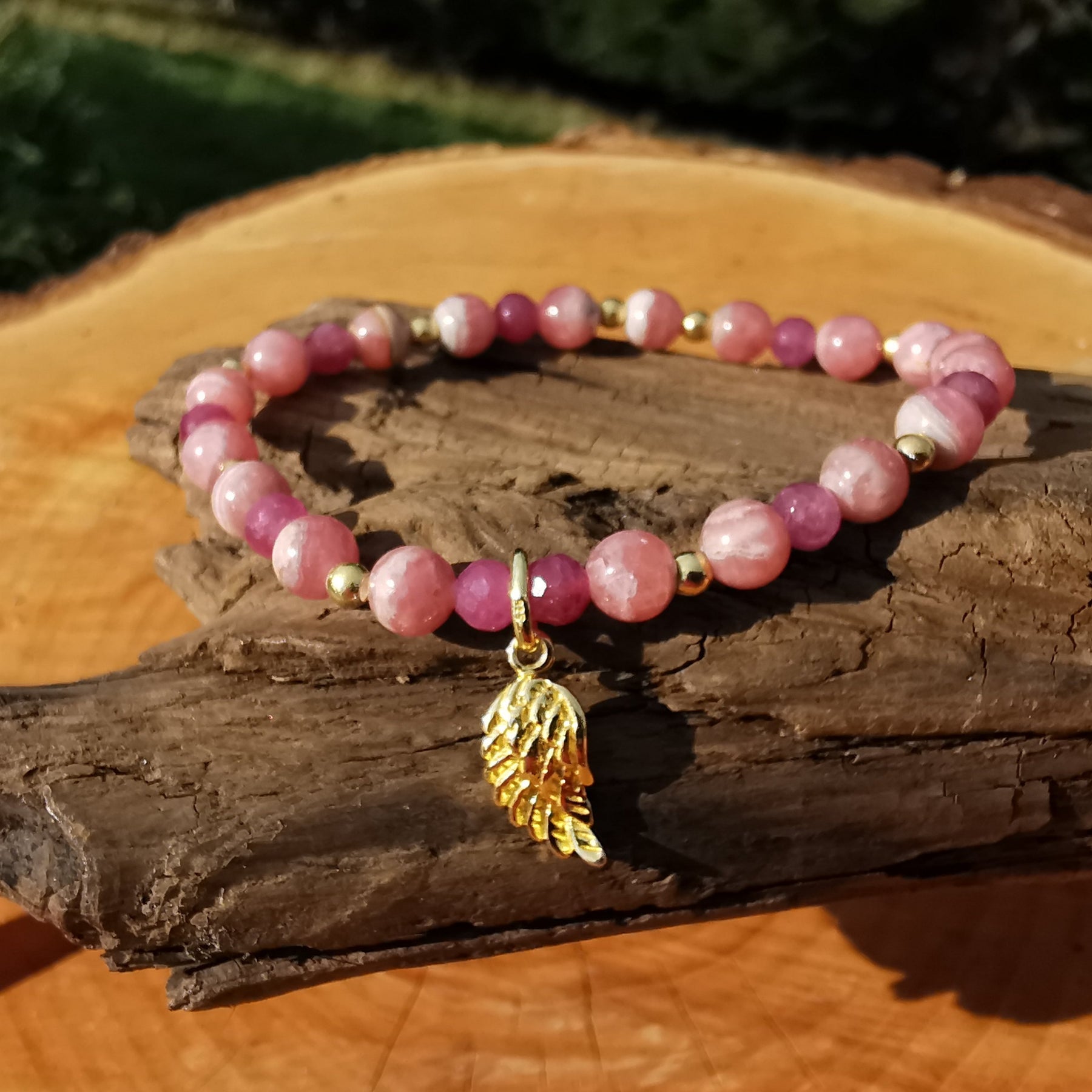Edelstein Armband LIEBE & TREUE mit Rhodochrosit & Rubin in EXTRAQUALITÄT Engelsflügel S925vergoldet 6mm
