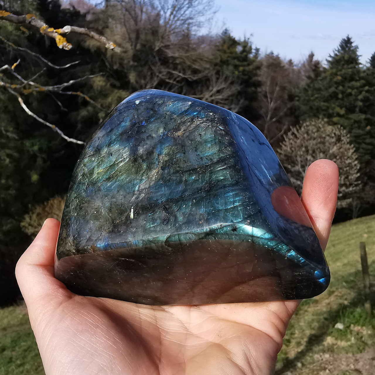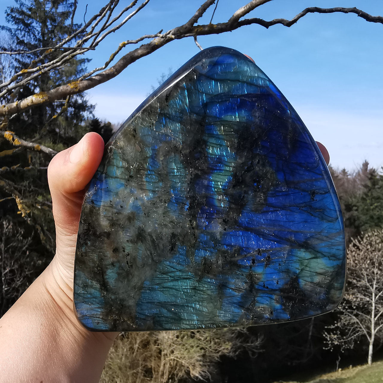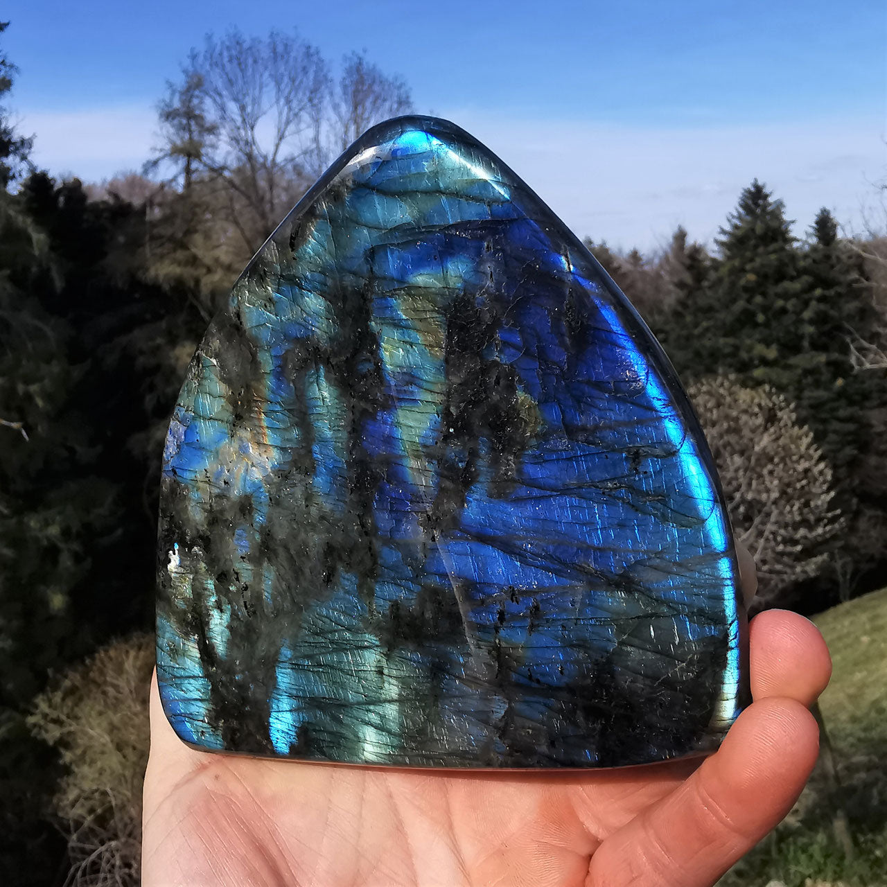 Wunderschöner schimmernder Labradorit von selten schöner Farbe! Poliert und mit Standfläche. Beidseitig in unterschiedlich schillernden Farben. In Echt noch schöner als auf den Fotos...