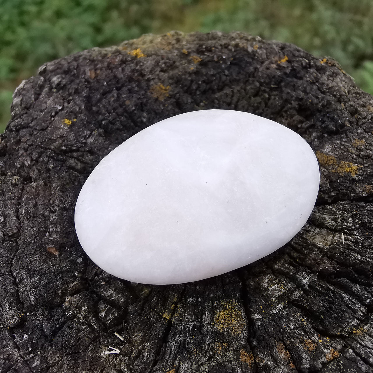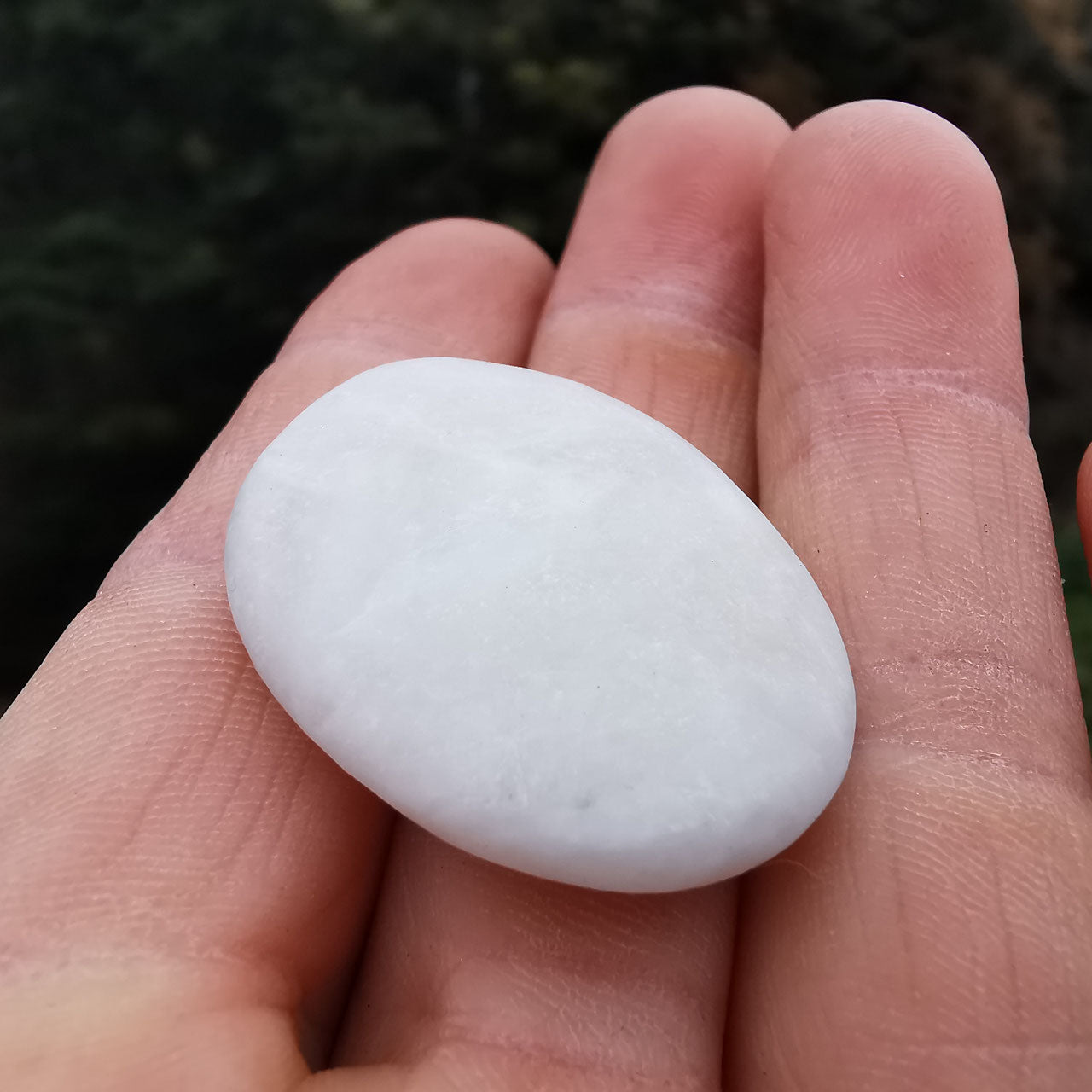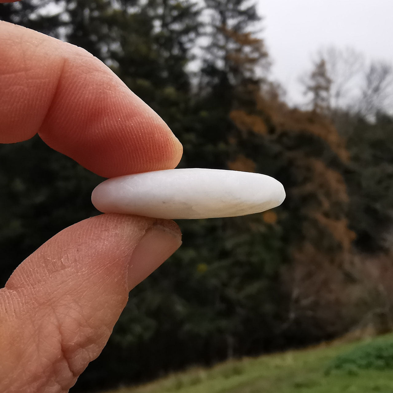 Diese Baryt Rohsteine wurden zu flachen, sogenannten, Taschensteinen geschliffen. Sehr schöne, fast schneeweiße Farbgebung! Praktisch zum Einstecken, da rund und glatt.
