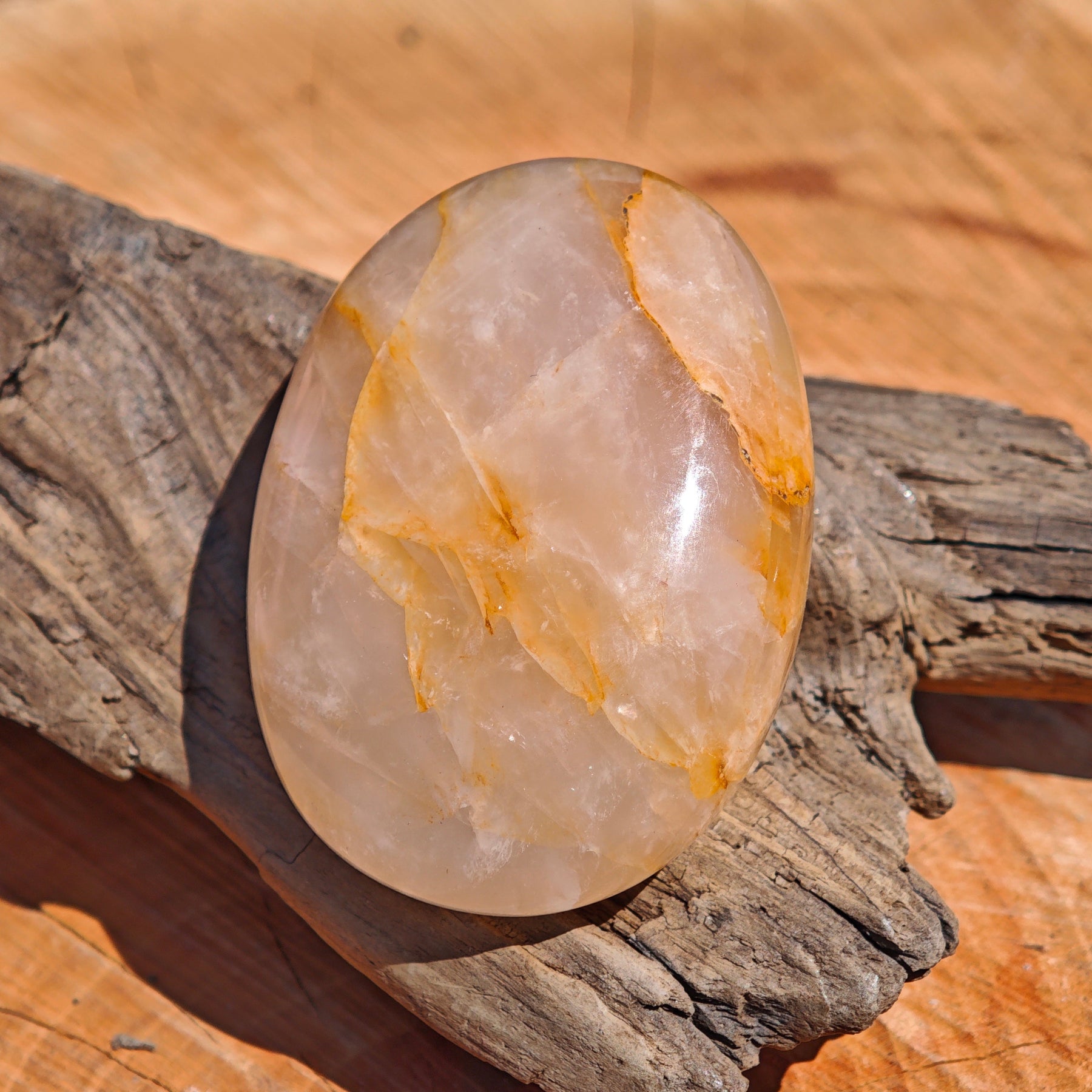 "Golden Healer" Handschmeichler in aussergewöhnlicher Qualität aus Madagaskar. Dies ist eine eher seltene Art des Bergkristalls. Durch seine Eisenoxidhaltigen Einschlüsse erhält er eine gelbliche Färbung und wird als "goldener Heiler" bezeichnet.