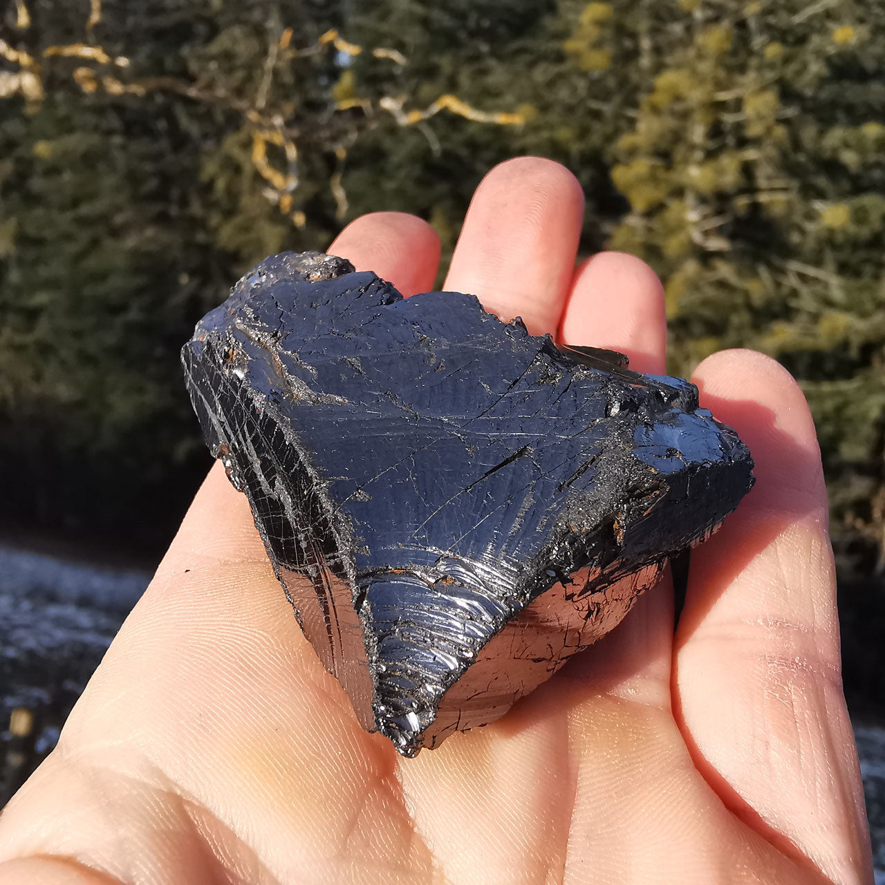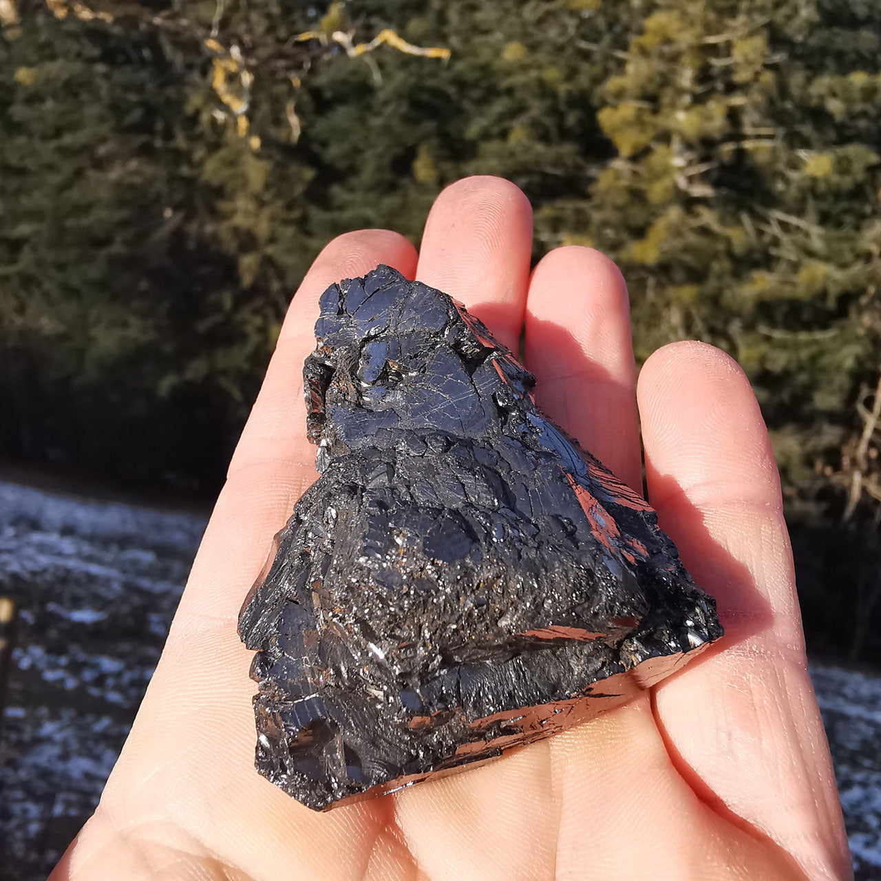 Edelschungit Rohstein naturbelassen, glänzend.