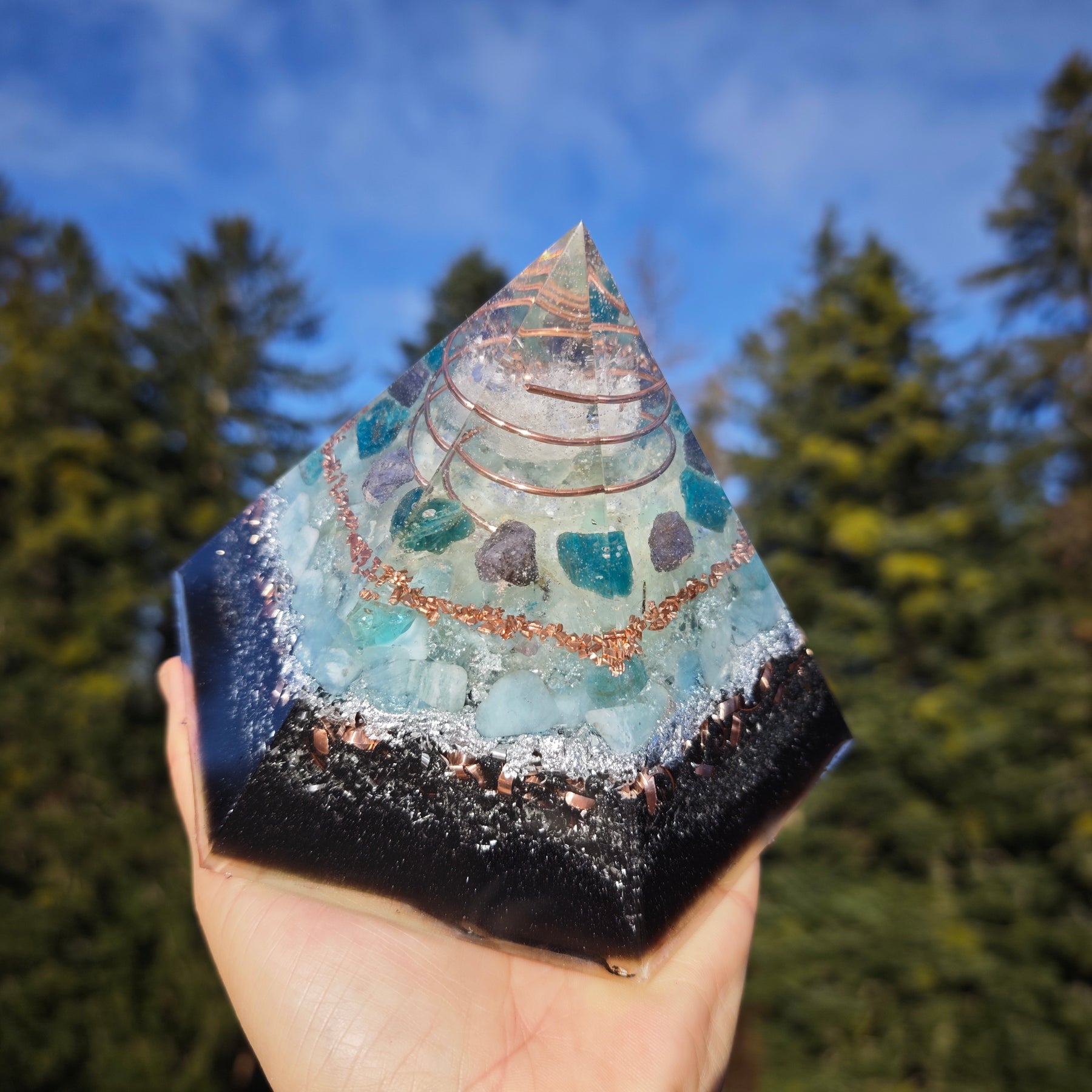 Orgone Hexagonal Pyramide MEDIALITÄT & URVERTRAUEN Bergkristall Aquamarin Apatit Tansanit ⌀16cm ↑13cm