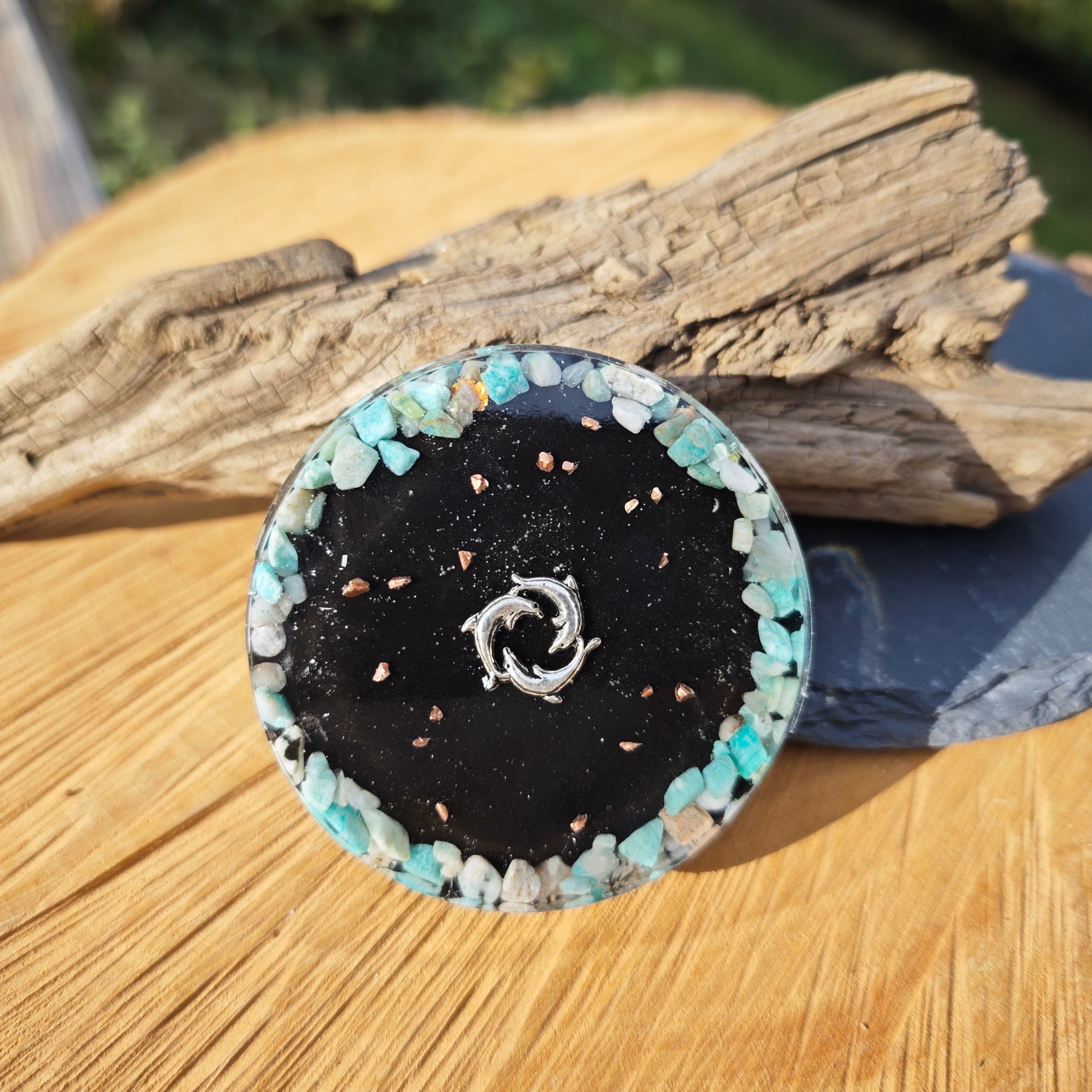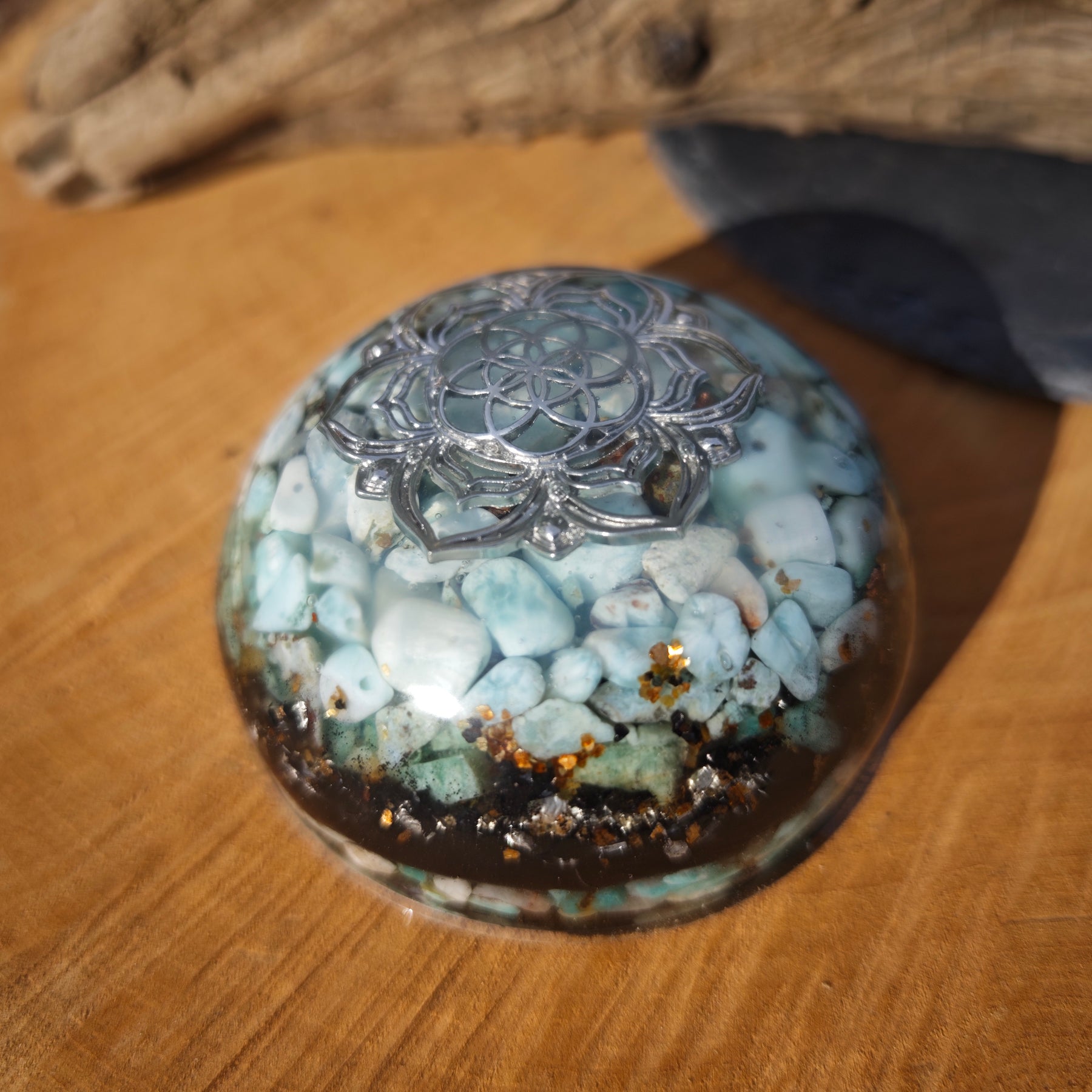Enthält: Larimar, Amazonit, Blume, Kupfer, Bergkristallspitze, Schwarzer Turmalin, Selenit Alu- und Edelstahlspäne, Pigment